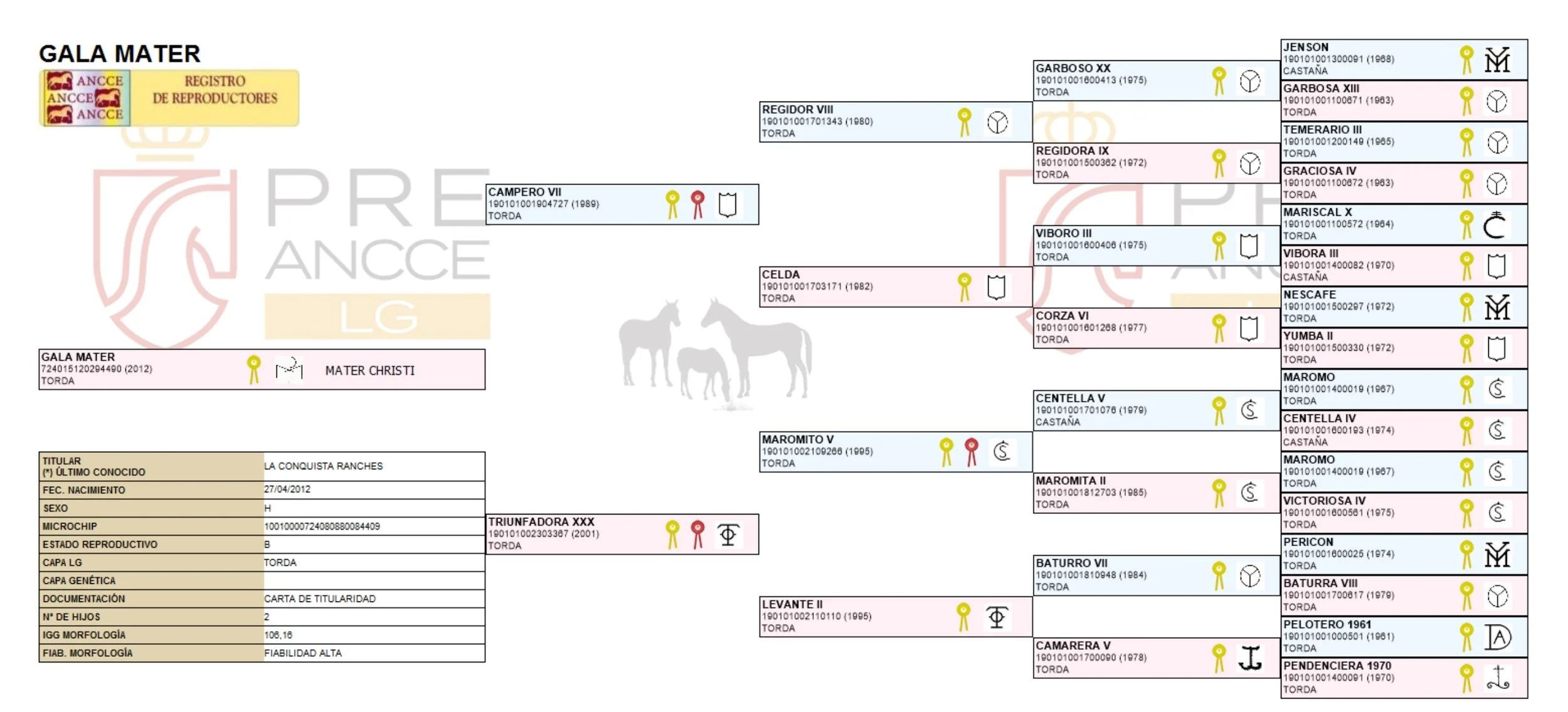 Daughter of multiple SICAB world champion mare TRIUNFADORA XXX - Gala Mater was born in Spain and is bred by one of the top PRE Spanish Horse Farm in Spain Yegunda Mater Christi. Gala is the ultimate foundation brood mare; and brings world class PRE bloodline and pedegree to our farm